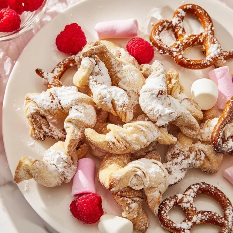 Pin A whimsical and elegant dessert board featuring crisp Polish angel wings (faworki/chrušciki) surrounded by a vibrant assortment of candies, fruits, and sweet dips — perfect for celebrations or a festive gathering.