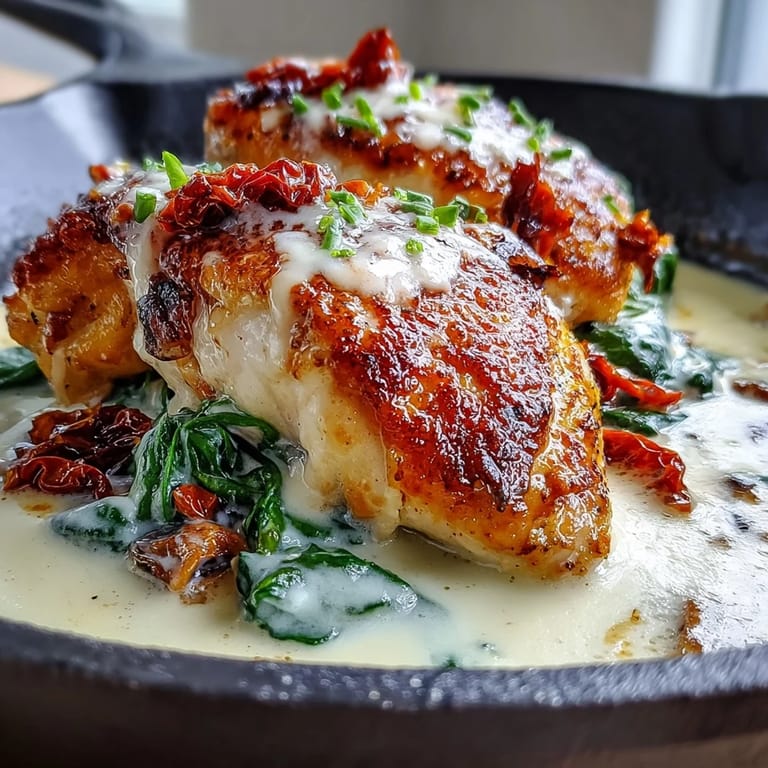 This Tuscan-inspired skillet showcases how a few quality ingredients can transform into something truly special. The sun-dried tomatoes add a concentrated burst of sweetness and umami, while fresh baby spinach wilts into the sauce, adding color and nutrients. Each chicken breast emerges tender and juicy, enveloped in a sauce that's creamy without being heavy. Whether you're cooking for family or entertaining guests, this dish delivers impressive results with minimal effort.