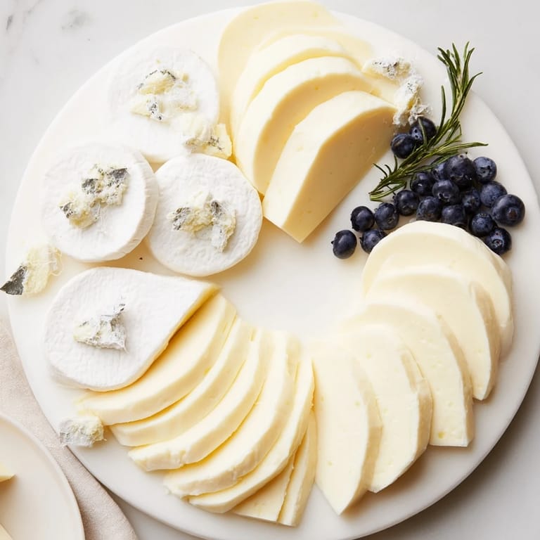 Chill the cheeses before slicing and assembling. Use a hot, dry knife for clean edges and wipe surfaces to maintain a pure white appearance.