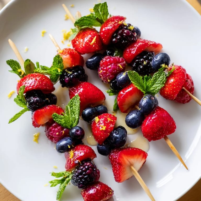 - Thread the berries onto wooden or metal skewers, alternating types and adding a mint leaf between every few berries for freshness.