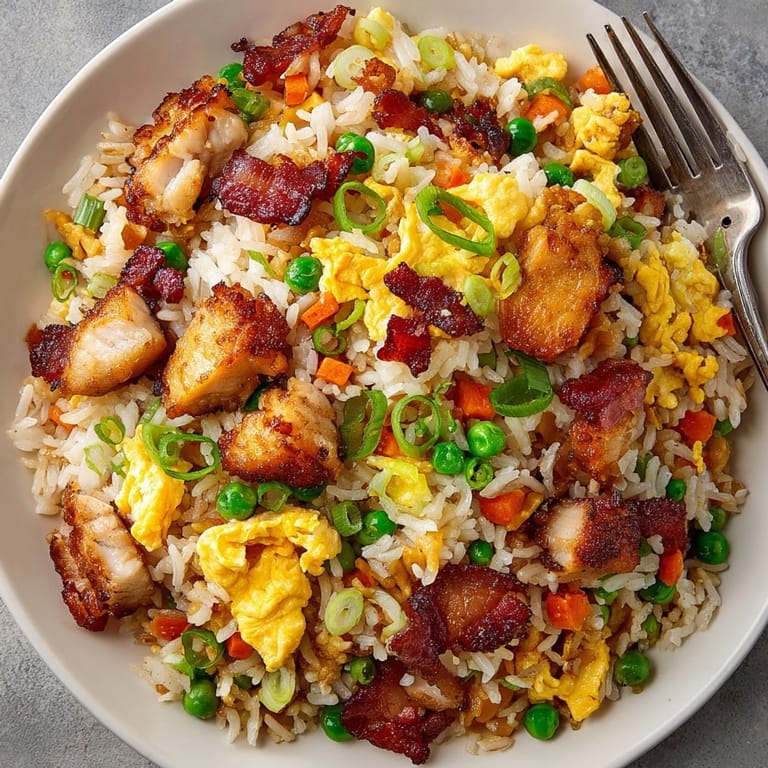This dish brings together juicy chicken, smoky bacon, and tender vegetables, all tossed with fluffy jasmine rice in a savory blend of soy, oyster, and sesame flavors. Quick to prepare and ideal for busy weeknights, it uses day-old rice to achieve classic texture, while eggs add extra richness. Customize by adding more vegetables or swapping the bacon for turkey. Whether served for lunch or dinner, it's a crowd-pleasing, Asian-inspired favorite with bold, comforting flavors in each bite.